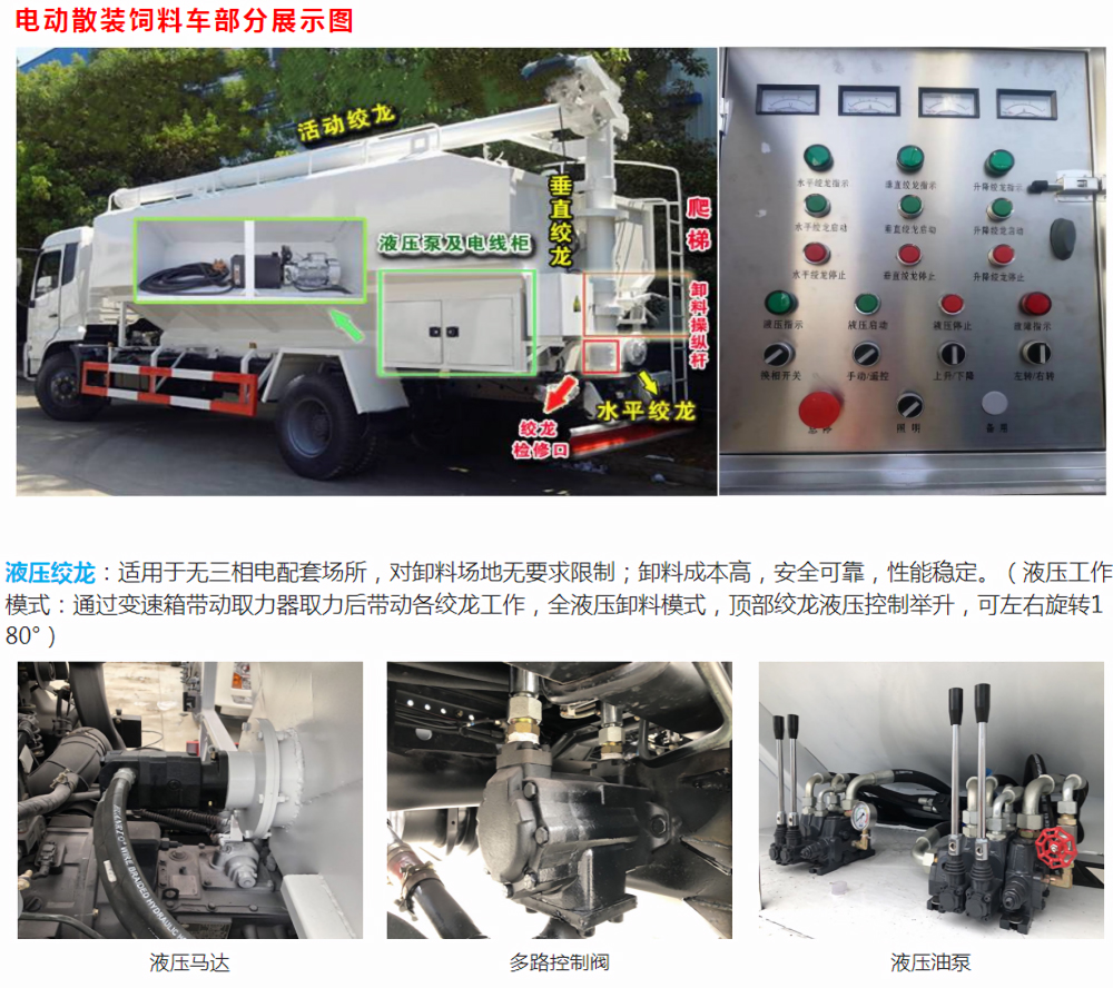 轉(zhuǎn),聯(lián)鎖保護(hù)等功能。無三相電場所可加裝車載發(fā)電機(jī)供電。卸料可選裝無線遙控操作。】第二種:液壓馬達(dá)卸