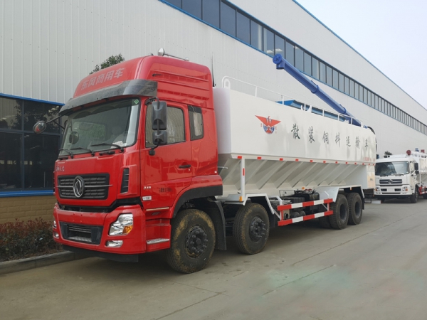 散裝飼料運輸車主要用于從飼料廠向畜牧場養(yǎng)禽場及飼料加工用戶運輸散裝飼料成品或飼料生產(chǎn)原糧,同時它也可用來運輸某些無腐蝕性粉粒狀原料,如制藥廠粉料和糧庫周轉(zhuǎn)。散裝飼料車的飼料罐架設(shè)在卡車的底盤上,罐頂開有進(jìn)料口.頂部的一根螺旋輸送卸料管(俗稱卸料絞龍)則可自由回轉(zhuǎn)和抬升,抬升的仰角可達(dá)60度。運輸時,頂部的螺旋管平臥在罐頂;卸料時則抬起,使管端的出料口與畜禽飼養(yǎng)場貯料罐頂部的進(jìn)料門相接,駕駛室內(nèi)裝有操縱裝置(操縱裝置也可裝置在罐體尾部),卸料時通過車底的動力輸出軸和減速器來驅(qū)動螺旋,以完成卸料。目前國內(nèi)主要推出3T、5T、8T、11T、15T和22T等多個噸位車型。