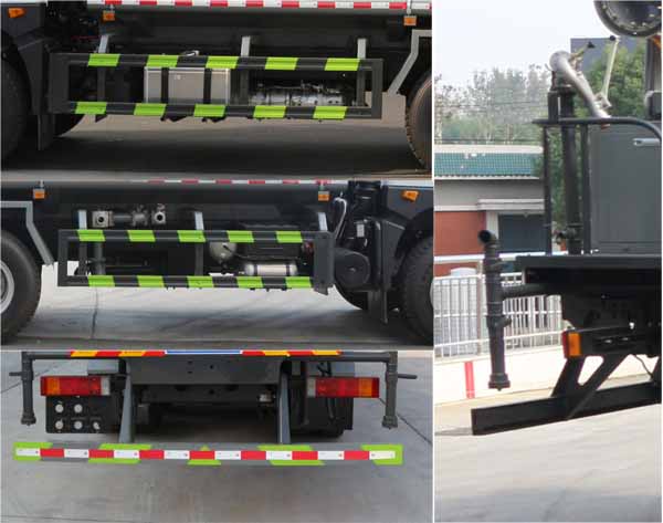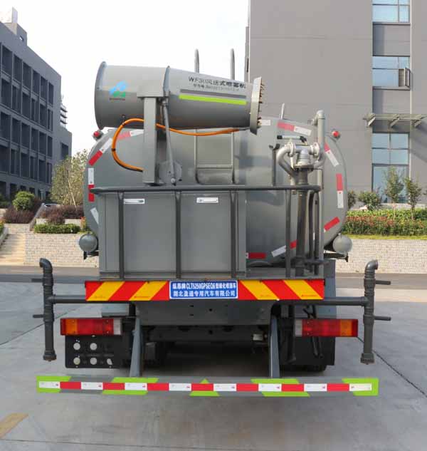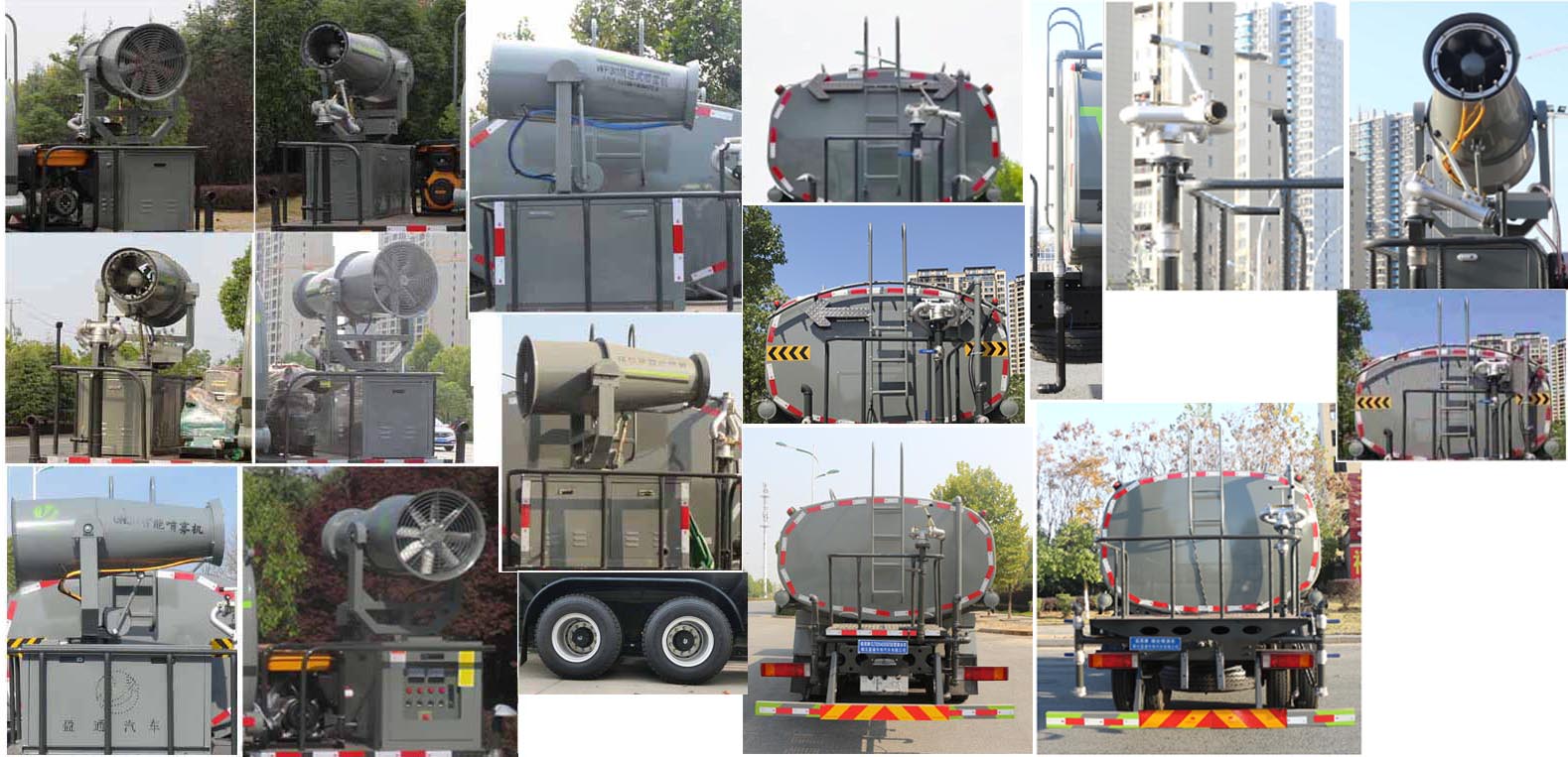 該車主要用于城鄉園林綠化噴灑;主要裝置為水罐及噴霧裝置;隨底盤選裝駕駛室,選裝噴霧裝置樣式,選裝罐體后部弧形高壓噴頭及箭頭指示燈;罐體總容量:14.81立方米;罐體有效容積:14.11立方米,罐體外形尺寸(×長軸×短軸)(mm):6800×2390×1620;側、后防護材料均為:Q235碳鋼,連接方式均為:螺栓連接,后部防護截面尺寸(mm):120×50,后部防護離地高度(mm):480;ABS型號及生產廠家為:3631010-C2000/東科克諾爾商用車制動系統(十堰)有限公司,J ABS/焦作博瑞克控制技術有限公司.僅采用底盤4350+1350軸距(mm)改裝。隨底盤選裝副水箱及支架、空濾尿素罐、電瓶框等位置布局。選裝后部樣式,選裝水炮支架位置,選裝高位花灑管道樣式,選裝弧形噴灑裝置,選裝箭頭燈裝置。