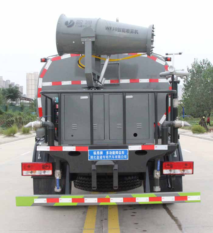 該車用途為抑塵降霾.主要裝置為罐體及噴霧裝置;罐體總容量:8.4立方米;罐體有效容積:8立方米;罐體外形尺寸(×長軸×短軸)(mm):4000×2100×1400.側、后防護材料均為:Q235碳鋼,連接方式均采用螺栓連接,后部防護截面尺寸(mm):120×50,后部防護離地高度(mm):450.ABS系統控制器型號:CM4XL-4S/4M,ABS系統控制器生產企業:廣州瑞立科密汽車電子股份有限公司.選裝前部電子炮樣式,選裝前部不帶電子水炮;當前部帶電子水炮時,車長為7950mm,前伸為500mm;當前部不帶電子水炮時,車長為7450mm,前伸為0mm.選裝噴霧裝置樣式,選裝罐體頂部高位花灑裝置,選裝大工作平臺,選裝車輛前部鴨嘴裝置,選裝自動球閥安裝位置,選裝箭頭燈裝置,選裝罐體頂部方形罐口及罐口位置,選裝尾部自流口裝置,后部作業燈僅在作業時開啟,車輛行駛過程中不可開啟.
