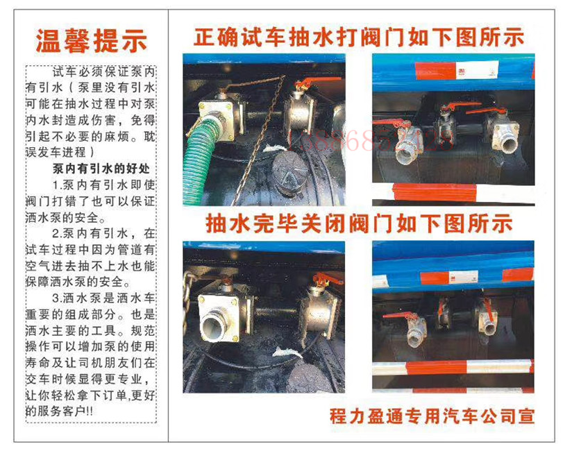 灑水車車載水泵的正常使用和常規(guī)保養(yǎng),隨著國內(nèi)經(jīng)濟(jì)的高速發(fā)展,國家對(duì)環(huán)保越來越重視,灑水車已經(jīng)普及到村鎮(zhèn)甚至各個(gè)廠和小區(qū),但是如何正確使用灑水車,好多司機(jī)朋友還沒有正真了解。為了避免因一些小問題而影響灑水效果,灑水車車載水泵的正常使用和常規(guī)保養(yǎng),湖北盈通專汽友情提示廣大司機(jī)朋友,注意以下問題,敬請(qǐng)惠存!!!