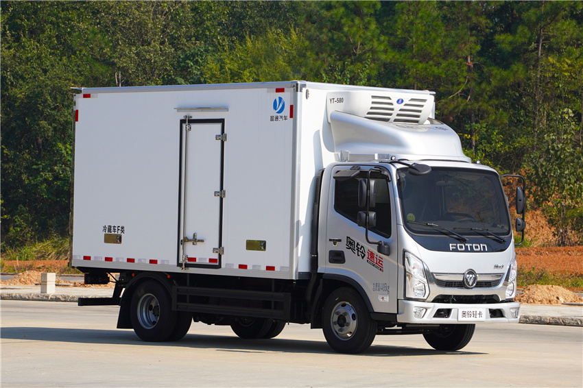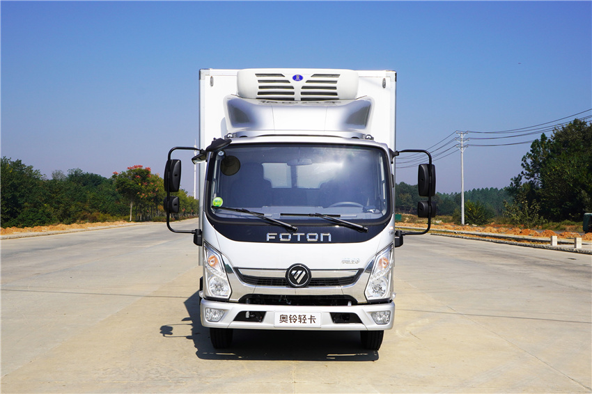 奧鈴速運冷藏車采用福田康明斯131/150/156馬力(F2.8NS6B131/F2.8NS6B150/F2.8NS6B156發動機,采埃付5變速箱,NPR沖壓后橋(帶制動襯片磨損報警),7.00R16輪胎,斷氣剎、單排翻轉、車載無線服務控制器(T-BOX)、ABS、離合助力、動轉,