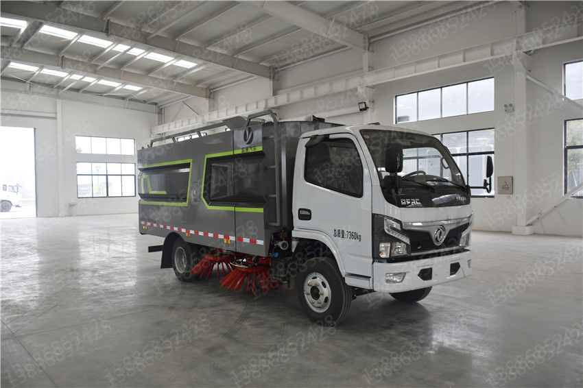 掃路車采用“中置四立掃+后置吸盤”的布置結構,掃刷是用 來清掃地面的垃圾及污垢,作業時掃刷由外向內把垃圾集中 掃到車輛底部,再通過吸嘴把垃圾吸入到垃圾箱內。