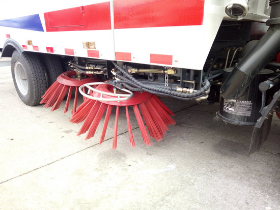 8、左右立掃為雙掃盤,掃刷上加裝噴水裝置,用于噴霧降塵。左右立掃分開控制,可實現右掃和全掃等不同的作業模式。