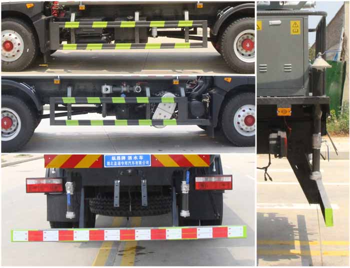 該車主要用于城鄉園林綠化噴灑作業;主要裝置為水罐及噴灑裝置;罐體總容量:10.7立方米;罐體有效容積:10.2立方米;罐體外形尺寸(長×長軸×短軸)(mm):4800×2300×1300.ABS系統生產廠家,型號:焦作博瑞克控制技術有限公司,J ABS;襄陽東風隆誠機械有限責任公司,ABS/ASR-24V-4S/4M.側、后防護材料均為:Q235碳鋼,連接方式均為:螺栓連接,后部防護截面尺寸(mm):120×50,后部防護離地高度(mm):480.隨底盤選裝限速裝置,限速89km/h.隨底盤選裝燃油箱,電瓶,尿素罐,儲氣筒左右安裝位置,選裝噴霧裝置樣式.選裝箭頭燈裝置,選裝前部電子水炮裝置樣式,選裝前部不帶電子水炮;當前部帶電子水炮時,前伸500mm,整車長度為9100mm,8550mm;當前部不帶電子水炮時,前伸為0mm,整車長度為8600mm,8050mm.選裝罐體頂部高位花灑裝置及方形罐口,選裝尾部自流口裝置,選裝工具箱.采用底盤4500mm軸距改裝.后軸僅采用鋼板彈簧懸架. |