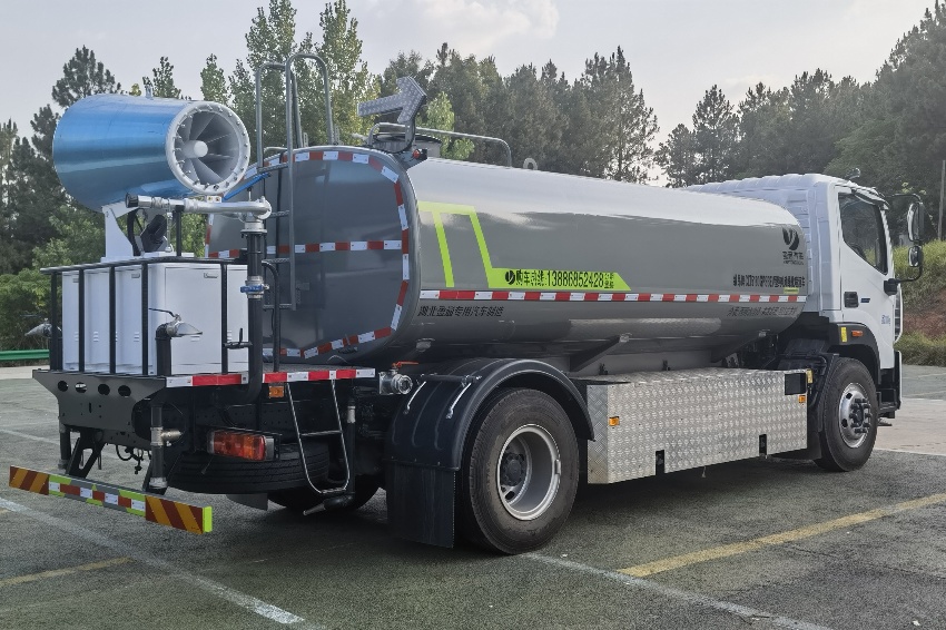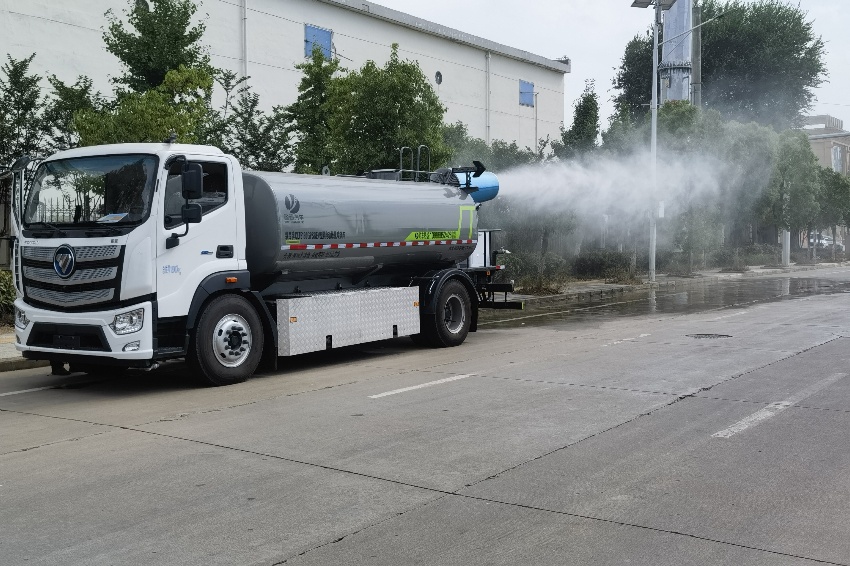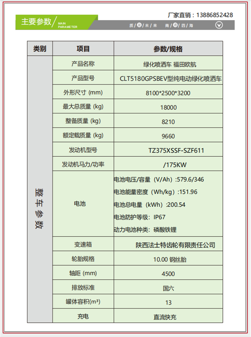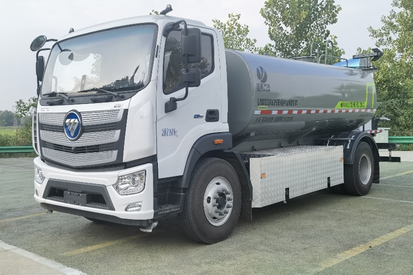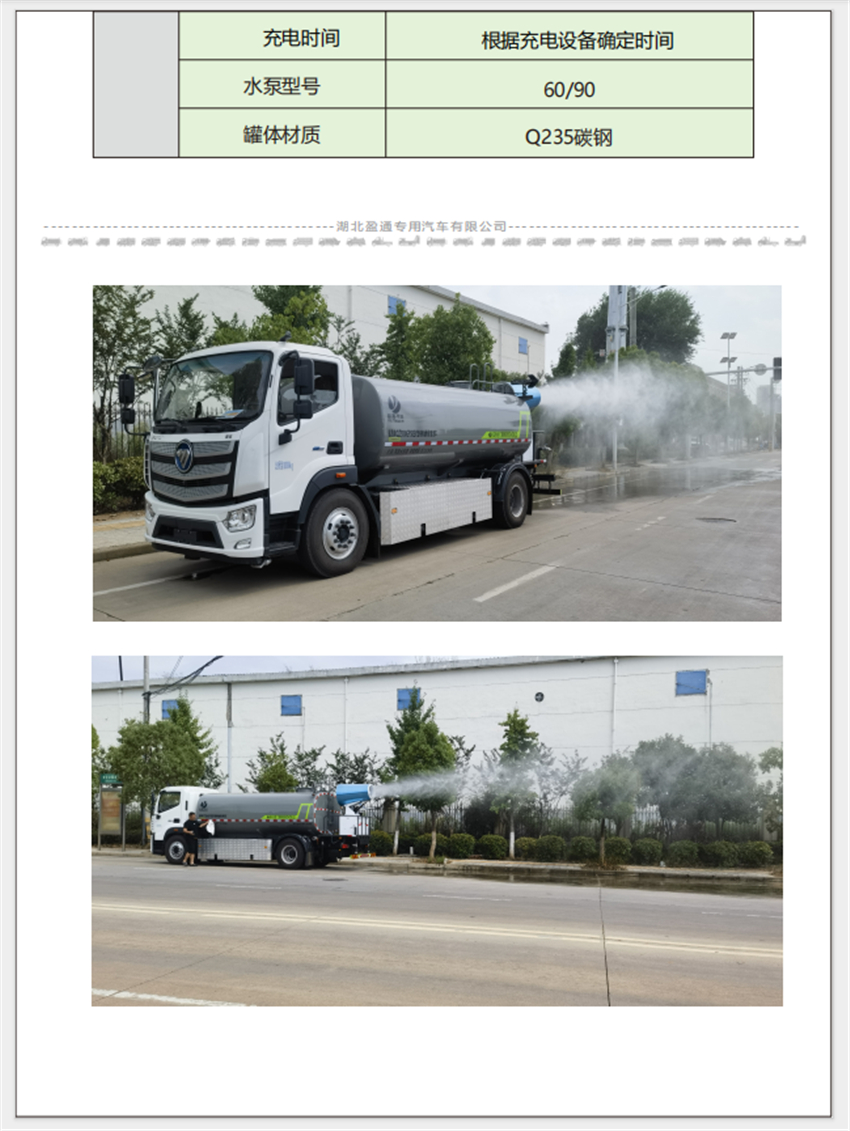 福田歐航灑水車_電動霧炮車_純電動灑水車,京牌13噸灑水車,湖北盈通專用汽車有限公司,該車主要用于城鄉園林綠化,路面噴灑;主要裝置為罐體及噴灑裝置.罐體總容量:10.6立方米;罐體有效容積10.1立方米;介質:丙酮水溶液,密度950千克/立方米,罐體外形尺寸(長×長軸×短軸)(mm):4600×2300×1450.側防護采用電池護罩代替,材料為Q235碳鋼,螺栓連接;后防護材料為:Q235碳鋼,連接方式為:螺栓連接,后部防護截面尺寸(mm):120×50,后部防護離地高度(mm):490;ABS型號/生產企業:ABS-E/采埃孚商用車系統(青島)有限公司;電池種類:磷酸鐵鋰電池,儲能裝置單體生產企業:寧德時代新能源科技股份有限公司,儲能裝置總成生產企業:寧德時代新能源科技股份有限公司;電機型號/生產企業:TZ375XSSF-SZF611/陜西法士特齒輪有限責任公司,額定功率:105kW,峰值功率:175kW.選裝前部電子水炮樣式,選裝前部不帶電子水炮,該狀態下車長為8100mm;當前部安裝電子水炮時,車長為8600mm,車輛前伸500mm.后部箭頭指示燈僅在車輛作業時開啟.選裝車輛前部鴨嘴裝置.選裝噴灑裝置樣式.選裝管道口位置.